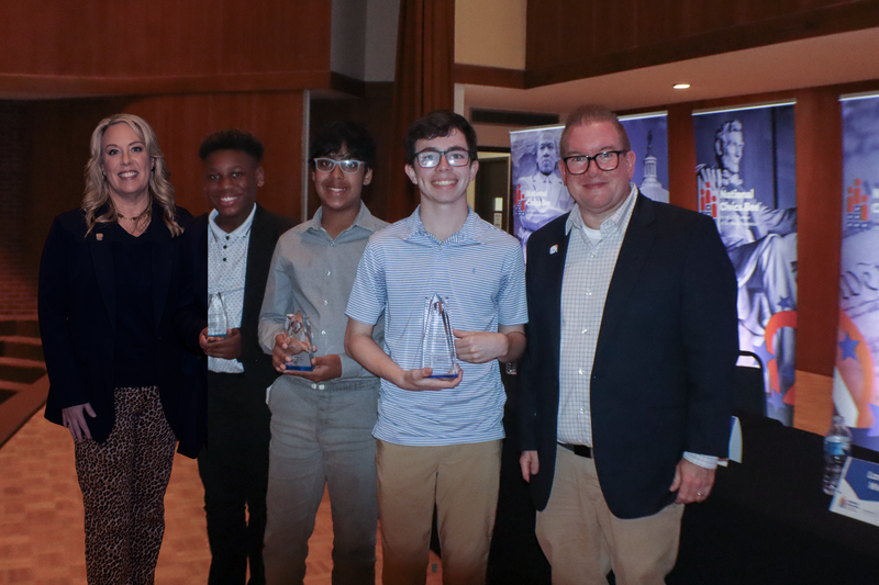 During the final round, the top five competitors stepped up to the microphone to present a short summary of their application essays, outlining their innovative ideas for solving a community issue. Following their presentations, the students participated in a live, unscripted Q&A session with a panel of judges, defending their ideas and demonstrating their understanding of civic principles.