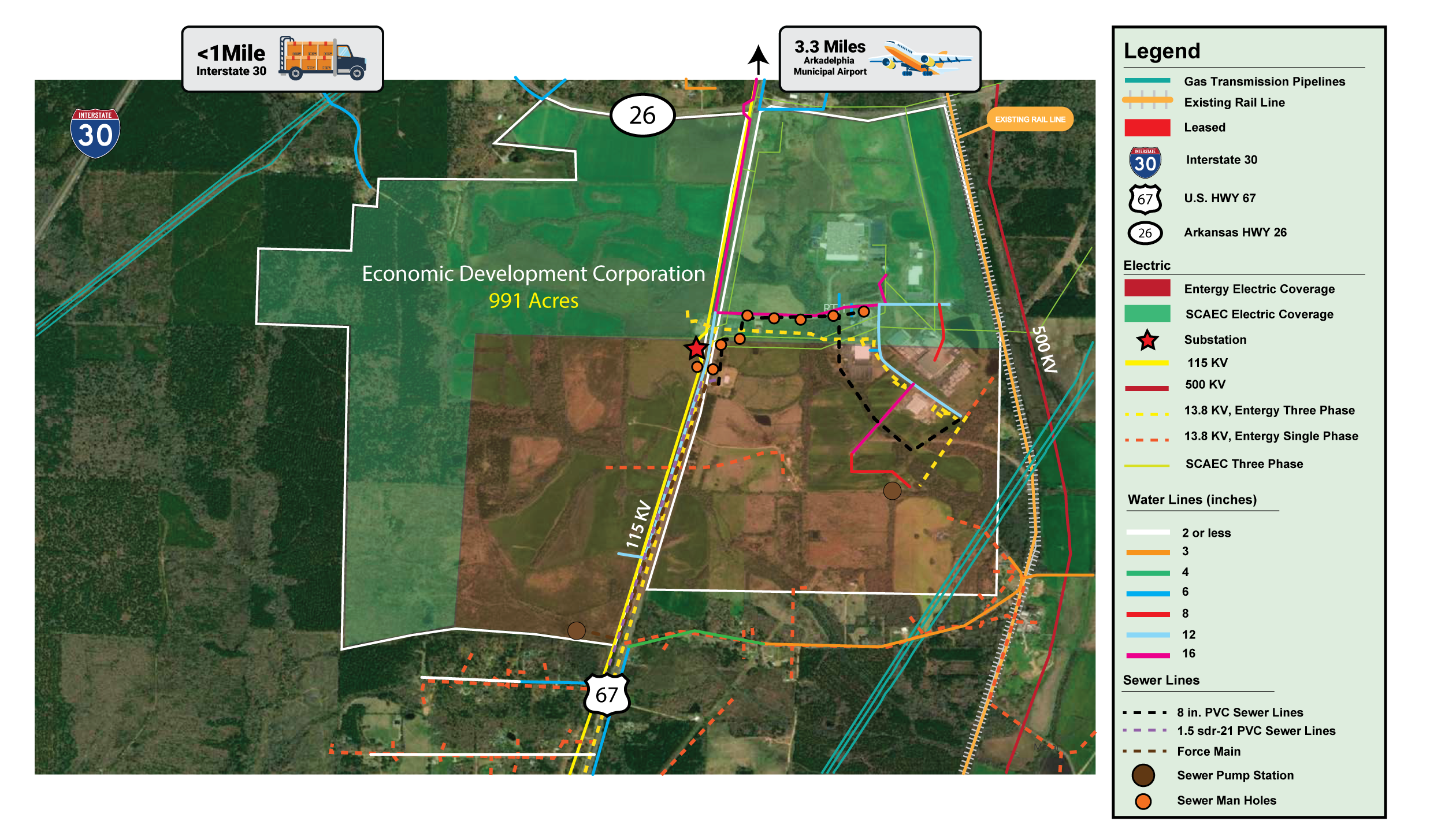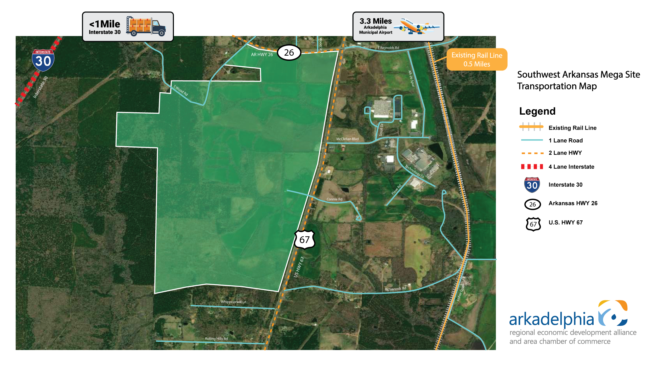 Position your business for success at one of Arkansas’s premier industrial sites! Located in Gum Springs, Arkansas, just one mile from Interstate 30 and adjacent to the Clark County Industrial Park, the Southwest Arkansas Mega Site offers 991 contiguous acres with extensive due diligence complete, infrastructure upgrades finalized in 2023, and a Conceptual Master Plan by Burns & McDonnell.
